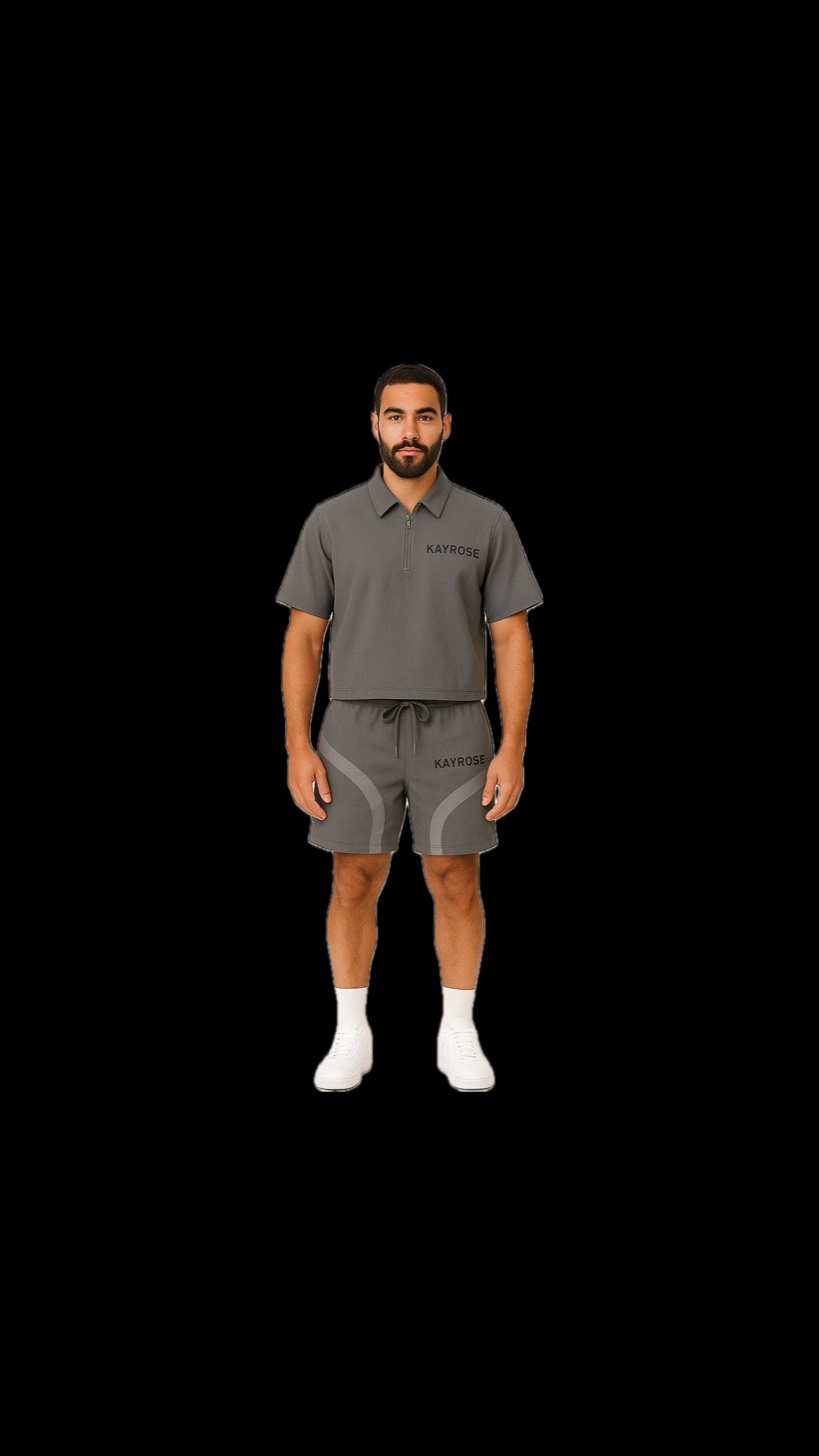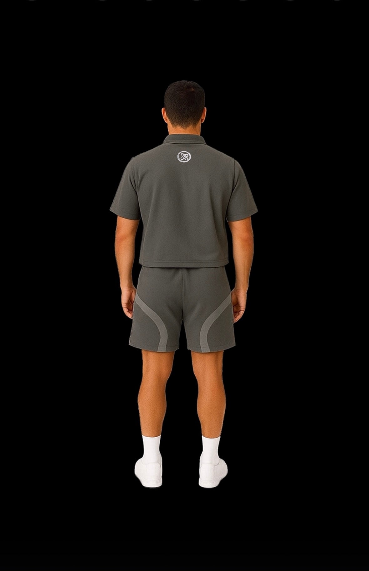 Ensemble en nylon droit et équilibré. Haut zippé col montant, taille élastiquée. Short net, sans flottement. Broderies logo emblématiques.
