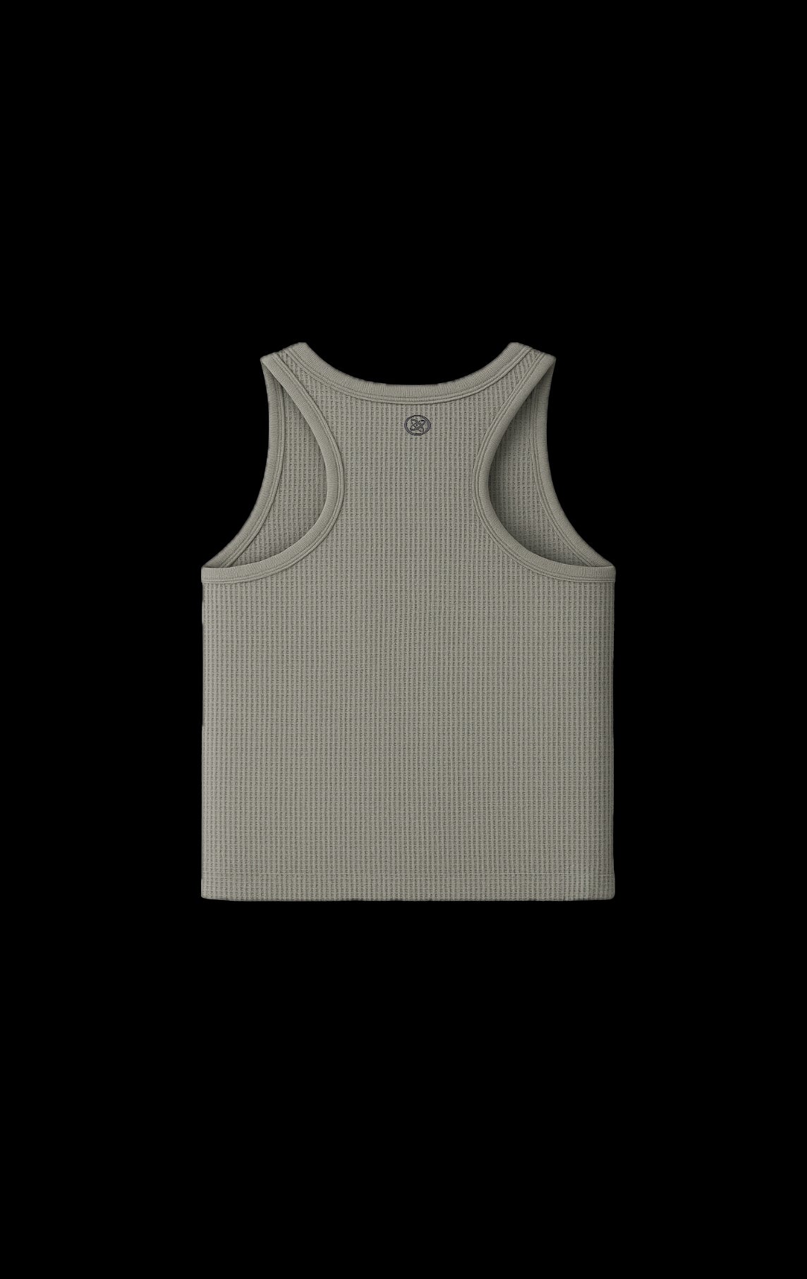 Débardeur en coton gaufré, texture sèche et souple. Coupe carrée au niveau du buste, posée sans rigideur, qui dessine une posture assurée — droite, calme. Près du corps sans contrainte. Élasticité naturelle, maintien net.